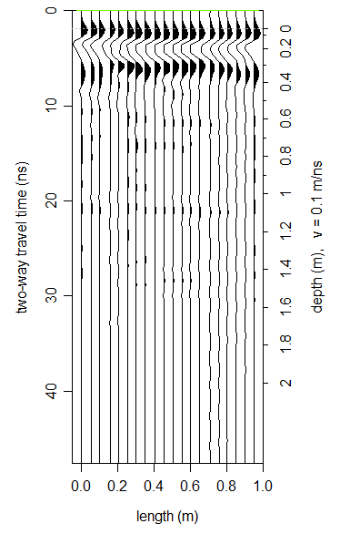 GPR data is usually collected as one-dimensional data. These data can be represented by a single “stream” of data from the surface down. It is usually collected with time on the x-axis and EM amplitude on the Y axis. Time is converted to depth using a known or derived velocity. These individual one-dimensional data streams are often collected one after another and strung together to make a 2D profile (See picture to the right, though the axes have been tilted to the side so that time/depth are on the vertical axis). These two-dimensional profiles can be displayed as a series of one-dimensional data (as in the picture to the right) or can be displayed as an image (i.e., the grayscale GPR data images shown in the previous sections). Sometimes only one-dimensional data is needed, and sometimes, multiple 2D profiles are collected together in a grid.