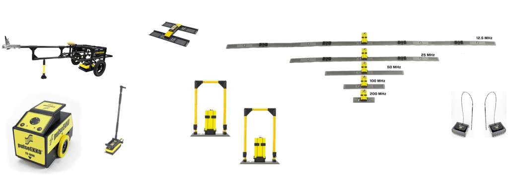 GPR instruments generally have two antennae: one for transmitting the radar signal, and one for receiving it. In most commercial applications, these antennae are contained in same instrument housing. This is often called a “monostatic” antenna configuration (though, technically, monostatic means there is only one antenna being used, but this is very rare in GPR). In most near-surface applications, monostatic GPR can be pushed along on a cart (see image above) or pulled on a sled. Often a GPS is used to locate the survey on the Earth and an “odometer wheel” may be used to measure precisely how far the GPR unit has moved to trigger measurements at even distances (for example, every 5 cm).