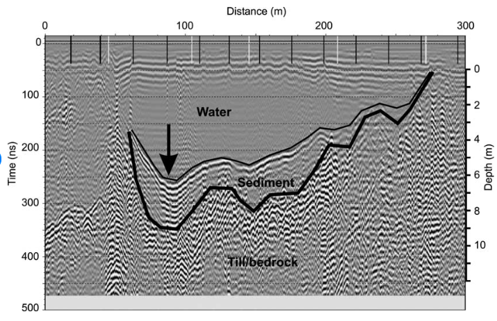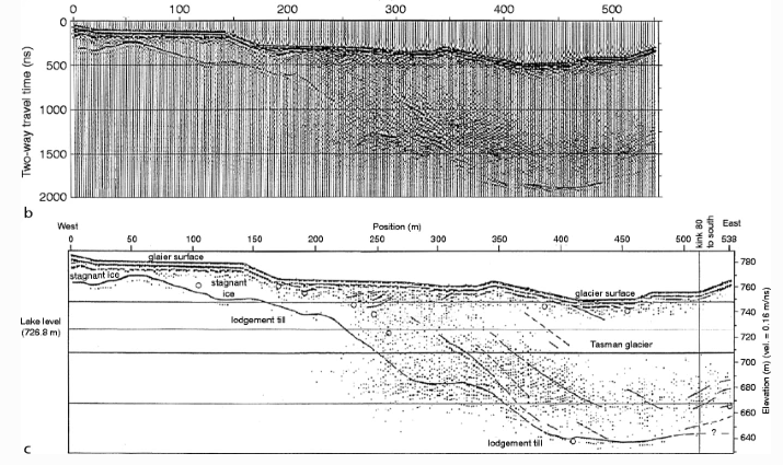 Because glacial ice is relatively consistent in its composition, GPR is able to travel through it without losing much energy. Then, when it hits the land surface below the glacier, it will reflect back a relatively large amount of energy. This is how we know that much of the land surface under the Greenland and Antarctic ice sheets are actually below sea level.