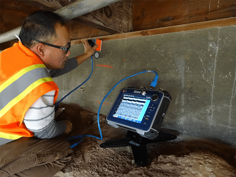 GPR is used extensively by engineers to detect voids, cracks, and other weaknesses in concrete to assess the competence and strength of the concrete. This is often referred to as Non-Destructive Evaluation, or NDE. GPR for NDE is used in bridges, dams, columns, foundations, and other concrete structures, or may be used to evaluate the conditions beneath these structures (this is especially important with dams, since moving groundwater can erode beneath man-made structures). In many cases, GPR used in this way has saved lives and contributed to the closing or repair of dilapidated structures, as was the case for the Oroville Dam spillway in 2017.