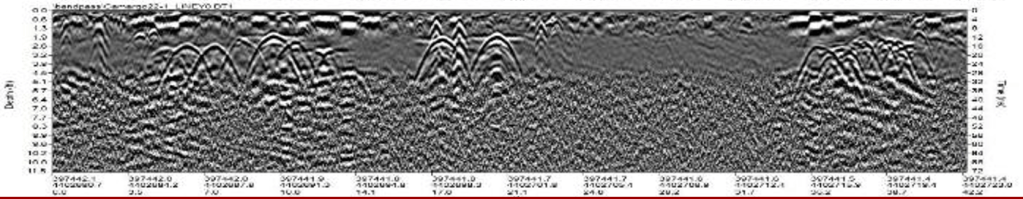 The data collected by GPR is processed using specialized software that converts the raw data into something that resembles an image of subsurface features based on the reflections detected by the receiver antenna. The software uses algorithms to filter out noise and remove the features (such as the hyperboles shown in the image in the Detecting Buried Objects subsection) that are part of GPR data acquisition, but which do not represent real objects or interfaces underground.